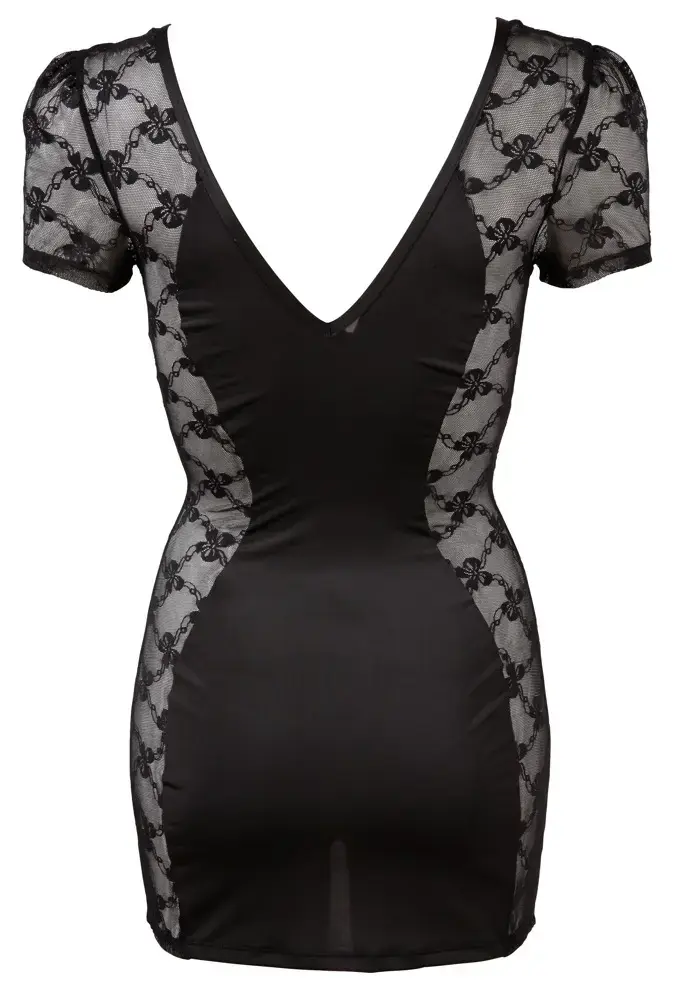 Atklājiet mazo melno kleitiņu, kurā iemīlēsieties. Šī pieguļošā, caurspīdīgā kleita ir papildināta ar smalkām mežģīņu sānu detaļām, īsām piedurknēm un drosmīgu, dziļu izgriezumu gan priekšpusē, gan aizmugurē.