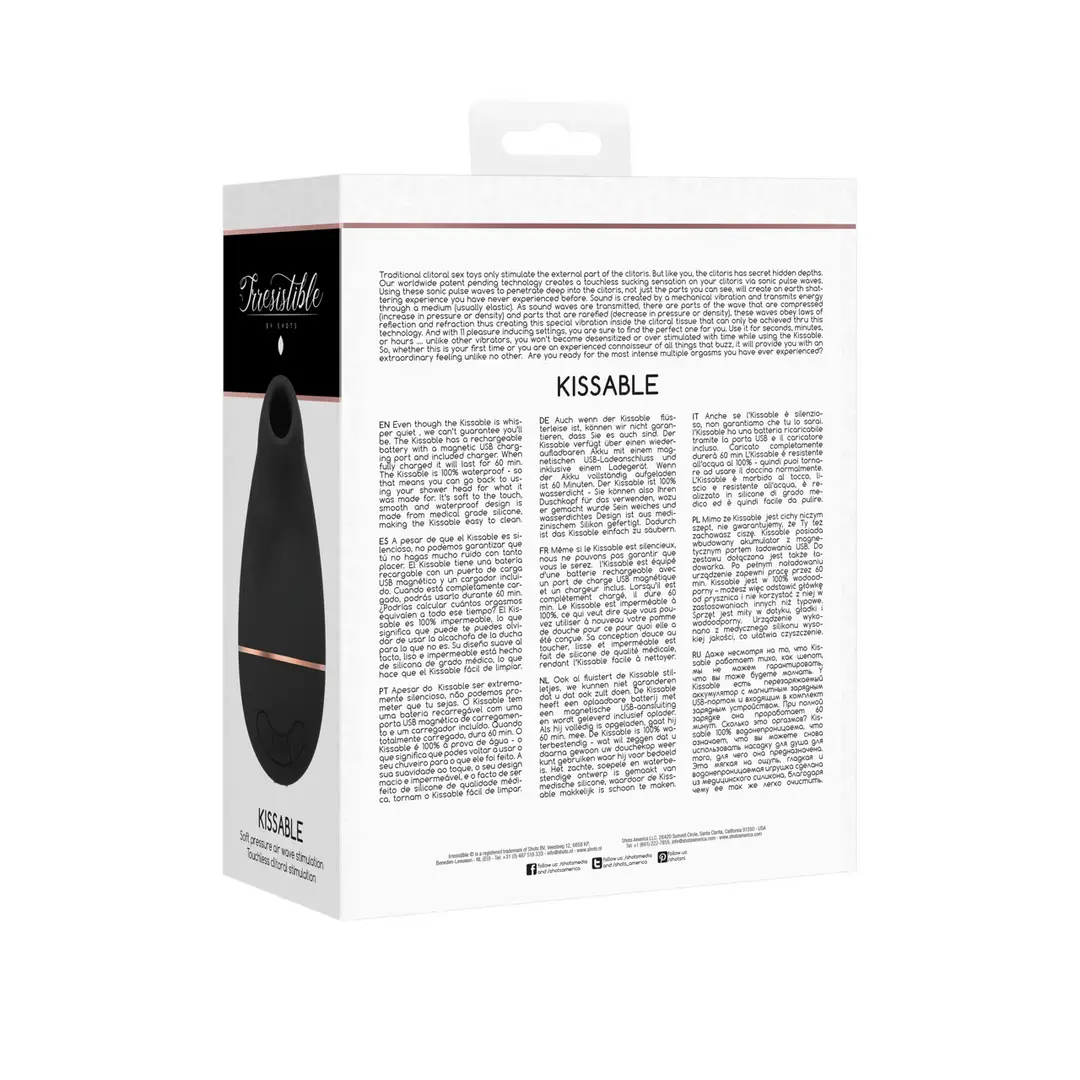 Izgatavots no augstas kvalitātes medicīniskā silikona, Kissable ir patīkams pieskārienam un 100% ūdensizturīgs, padarot to lieliski piemērotu lietošanai vannā vai dušā. Tā higiēniskā noslēgtā membrāna nodrošina izturību un vieglu tīrīšanu, savukārt uzlādējamais akumulators nodrošina līdz pat 60 minūtēm nepārtrauktas lietošanas.