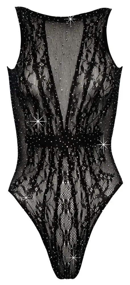 This sparkling one-piece bodysuit by Cottelli Fantasy is designed to awaken your deepest desires. Crafted from fine, soft, and semi-transparent stretch material, it features an all-over decoration of rhinestones in various sizes that catch the light beautifully. The front is adorned with an elegant woven tendril pattern, while the upper back boasts a sophisticated cutout for a touch of allure.
