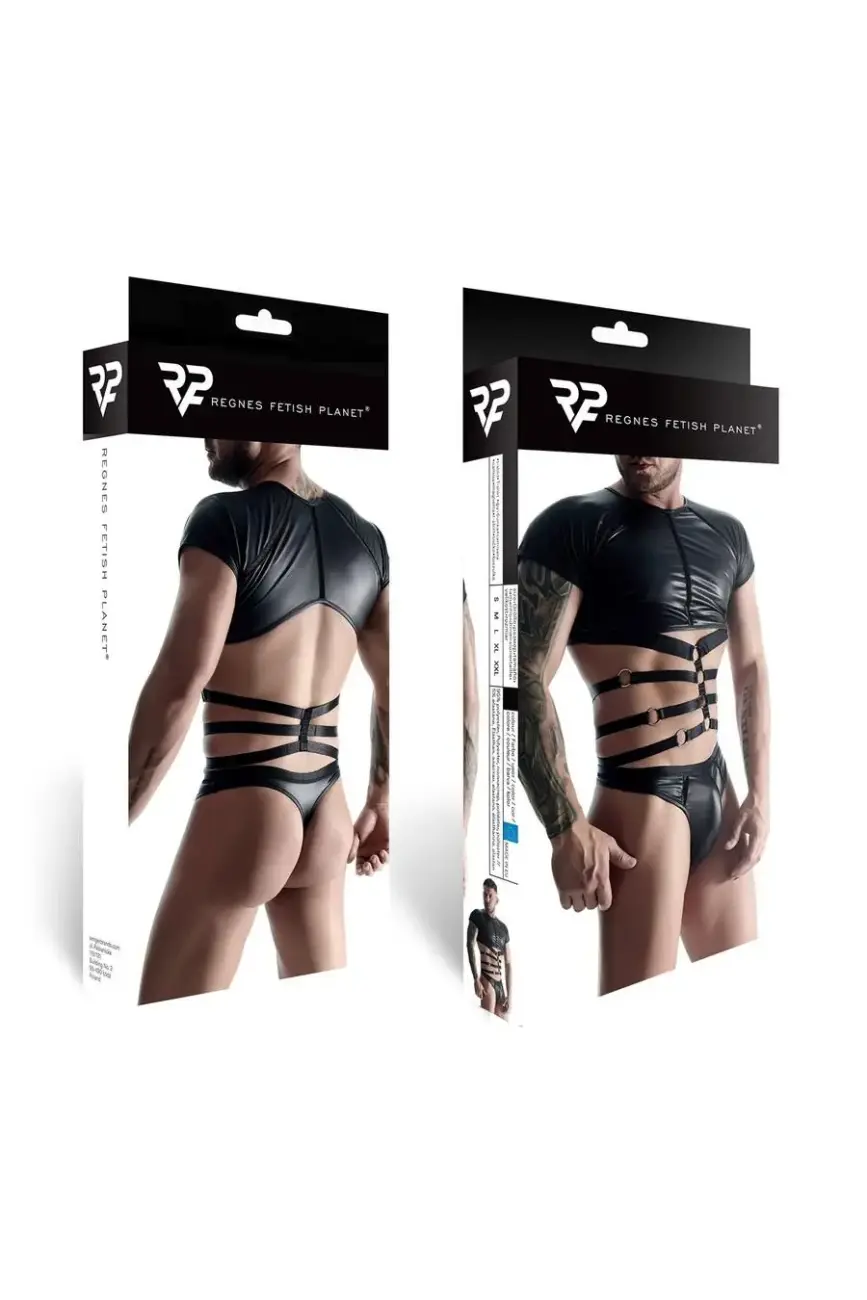 Patirkite šio vyriško wetlook komplekto žavesį, kurį sudaro T-shirt su dekoratyvine gumyte ir stringai su dekoratyvine juostele. Sukurtas šiuolaikiniam vyrui, kuris priima savo troškimus ir vertina aukštos kokybės, unikalius fetish drabužius. Šis komplektas puikiai tinka clubwear ar ypatingoms intymioms progoms, siūlydamas komforto, ilgaamžiškumo ir viliojančios estetikos derinį.