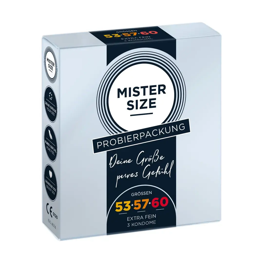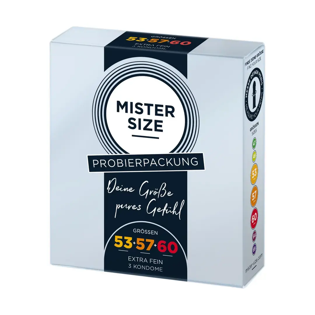 Откройте для себя идеальный размер с тестовым набором MISTER SIZE Pure Feel. В этот комплект входят три разных размера — 53 мм, 57 мм и 60 мм, что позволяет экспериментировать и найти наиболее удобный и безопасный вариант для вас.