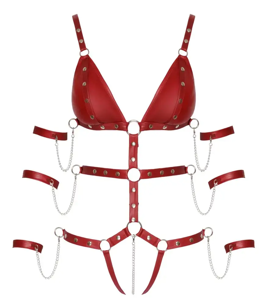 This captivating one-piece bodysuit from Bad Kitty offers an extravagant bondage-inspired look. Crafted from soft, stretchy straps in a noble dark red matte finish, it features openable cups with press studs and a detachable snap hook chain in the open crotch. Adjustable straps with press studs ensure a perfect fit. The design is completed with six detachable ankle straps for hands/arms, featuring snap chains connected to side rings on the body, and narrow ankle straps with adjustable hook-and-loop fasteners.