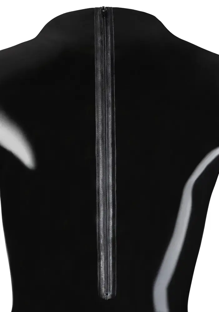 Queen of the night! This jet-black, shiny bodysuit with long sleeves is designed to perfectly emphasize feminine curves. It features a versatile zip that can be worn at the front or the back, and an additional zip over the crotch for added convenience and allure.