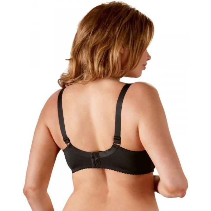 Black underwired shelf bra with slightly padded cups, bones at the sides and extra wide adjustable straps. Its stretchy material means that it fits perfectly and it also shows off the feminine curves in a stunning way.