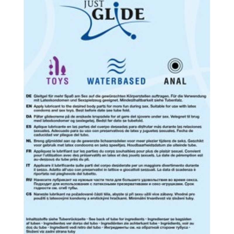 3 Just Glide lubricants in one economy pack. The water-based lubricant is 100% vegan and is also suitable for sensitive skin. Non-greasy and free from oil. Washable. Safe to use with latex condoms.