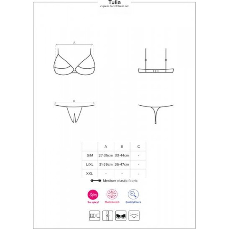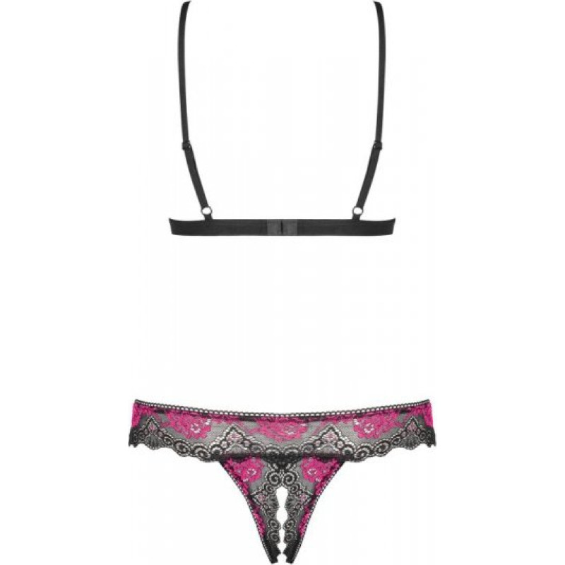 Piquancy and sexiness? Try this amazing combination! It’s full of tempting details: - cupless, softly padded bra – bust is exposed - crotchless thong – sooo spicy! - adjustable straps and multistage closure – perfect fitting - charming lace with rosy pattern - two sexy bows - this set consists of bra and thong - fabrics are soft and elastic (90% polyamide, 10% spandex) 90% polyamide, 10% spandex
