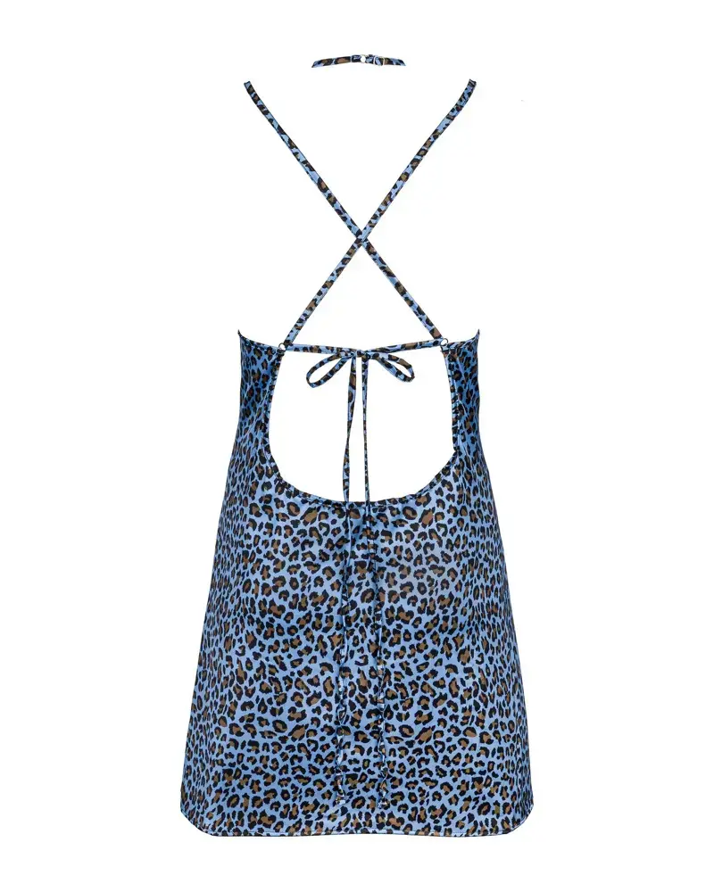 Комплект отличается уникальным дизайном, сочетающим красивый синий цвет и сексуальный леопардовый принт. Сорочка имеет глубокий вырез, отделанный нежным кружевом, ювелирное украшение под грудью и удобные бретели, которые перекрещиваются на лопатках, создавая женственный образ. В комплект входят подходящие стринги, выполненные из мягкого, атласного материала.